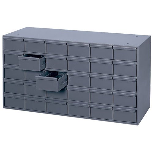 Durham 014-95 Gray, 30 drawer cabinets. Drawers feature sides slotted on one inch centers to hold high impact plastic dividers in place. They also have two easy glide runners and full width. Each drawer includes 2 easy to label dividers. Dividers are adjustable on 1" centers. Cabinets can be stacked using mounting holes. Modular with other 33-3/4" wide drawer cabinets and bins. Durable gray powder coat finish. Ships fully assembled. Overall measures 33-3/4" width by 17-3/4" height by 11-5/8" depth.